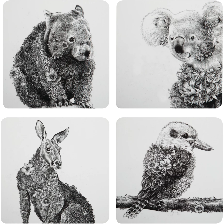 The Marini Ferlazzo cork-back coasters are created in collaboration with Melbourne artist, Nathan Ferlazzo showcasing Australia’s native fauna in intricate detail. Using a traditional nib and ink technique, each set of coasters feature his original artworks.